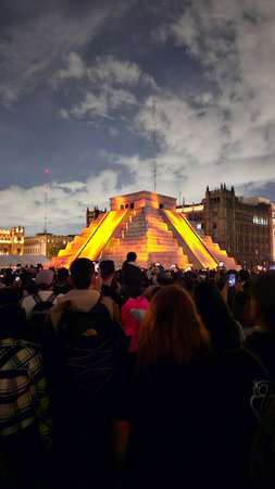 Mexico City, Mexico - Jul 12 2024: Audiovisual video mapping show in a replica of the Kukulcan Yucatan pyramid in the Zocalo of CDMX