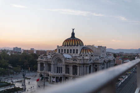 Beautiful view of Palace of Fine Arts from Mexico City under sunset sky