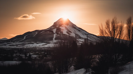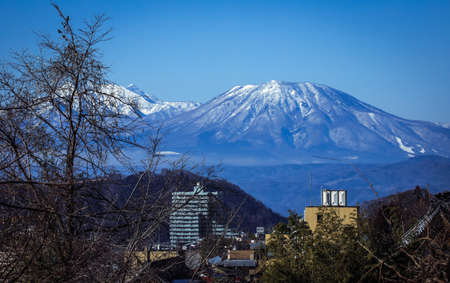 Close up Mount Yotei (inactive stratovolcano) with village on the foot hill and snow cover on the ground in winter in Hokkaido, Japan.