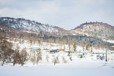 Bakuriani ski resort panorama in Georgia, caucasus mountains. Famous travel destination for outdoors skiing