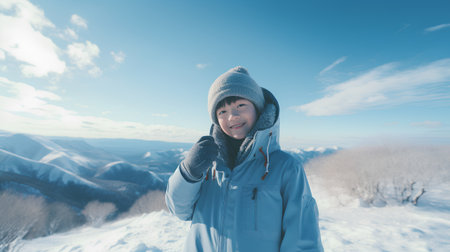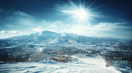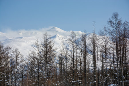 Snowy mountain peaks on a sunny winter day, Hokkaido, Japan.