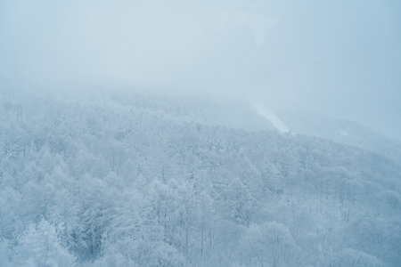 View of Snow monster in Winter day at Mount Zao ski resort, Yamagata prefecture, Japan. powder snow covered in frosty weather. Travel, Adventure and Vacation background