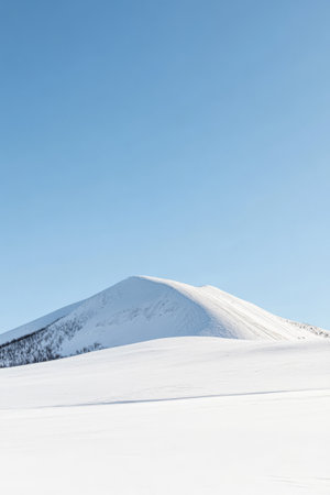 A majestic mountain rises covered in pure white snow surrounded by a vast pristine landscape. The clear blue sky adds to the serenity of this tranquil winter scene with a distant forest line.
