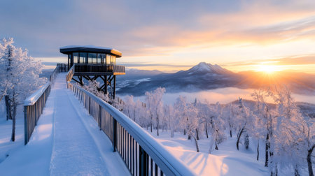 Snow covered wooden walkway leading to modern observation tower in beautiful winter mountain scenery at sunrise