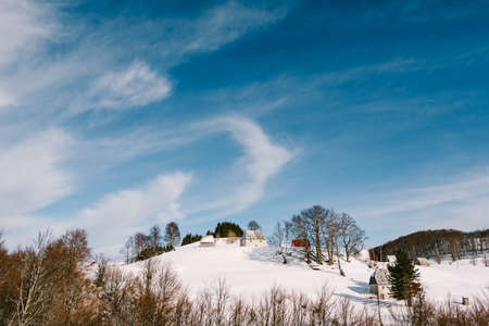 Houses in the north of Montenegro, on a hill among the trees, in winter on the snow against a blue sky with cirrus clouds