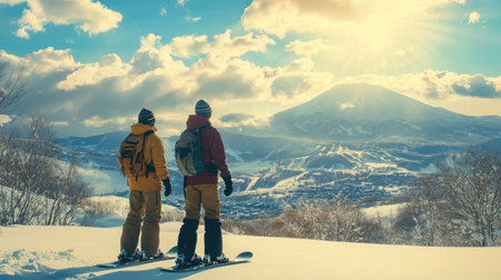 Two snowboarders pause on the slopes of Furano, taking in the stunning view of Daisetsuzan and Tokachidake mountains, with bright sunshine illuminating the snow.