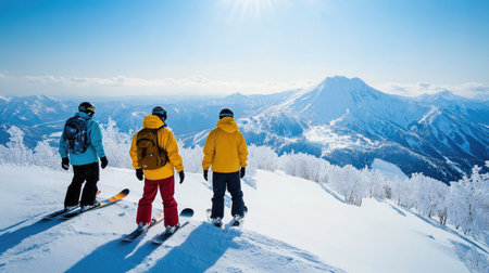 Group of snowboarders standing at the edge of Furano ski resort, admiring the snowy peaks of Tokachidake and Daisetsuzan mountains under a clear, sunny sky.