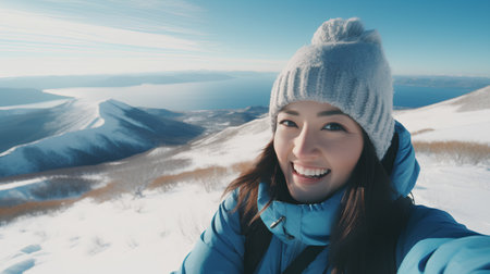 Beautiful young woman taking a selfie in the winter mountains. Winter landscape.