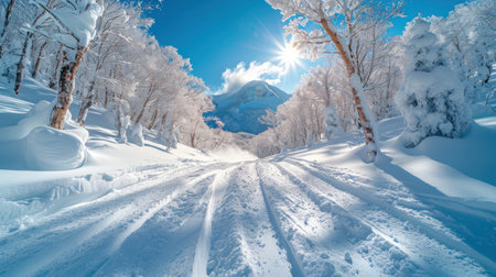 Snowy road with mountain view. Winter alpine scenic landscape nature. Generate ai