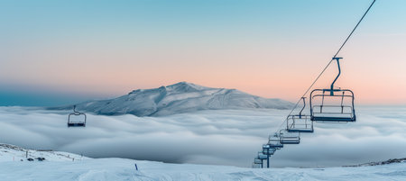Empty Chairlift Soaring Over a Sea Of Clouds at Sunset, Snowy Mountain Peak in the Distance