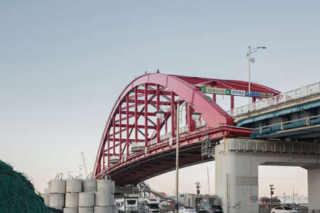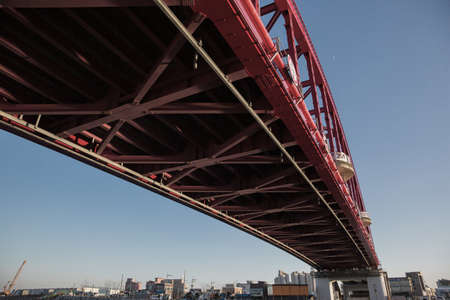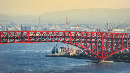 OSAKA, JAPAN - OCTOBER 28: Minato Bridge in Osaka, Japan on October 28, 2014. Opened in 1974, a double-deck cantilever truss bridge. It is the third-longest cantilever truss span in the world