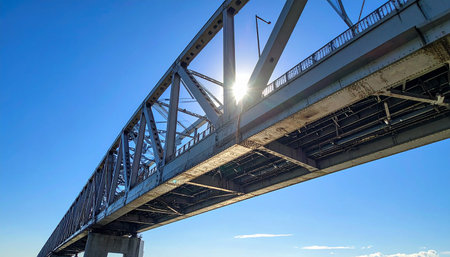 Railway bridge with blue sky and sun in a sunny day.