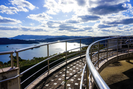 Visitors Enjoying the View From Mt Inasa Observation Platform Deck in Sunny Day Sunset Time with Blue Sky Backgro und, famous beauty scenic spot in the world. Nagasaki City, Nagasaki Reflection, Japan
