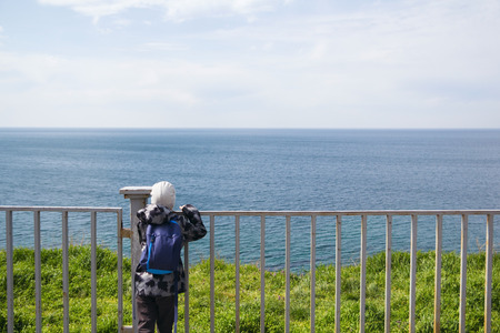 A child stands on the promenade and watching the sea through the fence