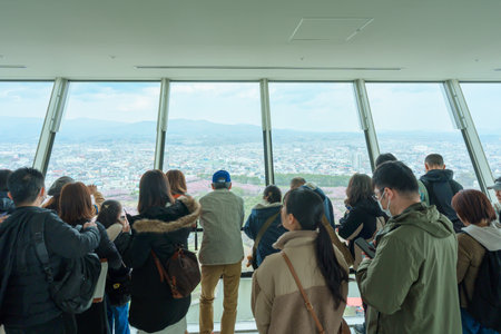 tourists Visiting in Hakodate city, Travelers sightseeing view from Goryokaku Tower with sakura cherry blossom in spring. Hokkaido, Japan, 26 April 2025