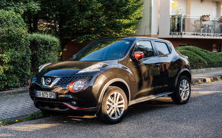Paris, France - Sep 24, 2017: Beautiful gray Nissan Juke SUV car parked on a French city street on a summer day near a typical French property apartment building