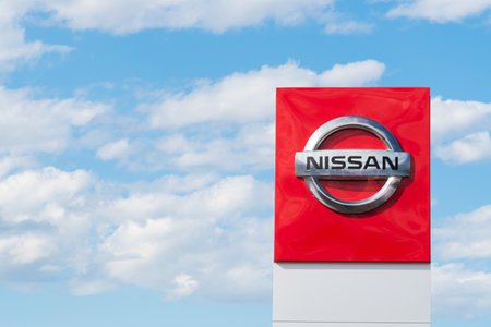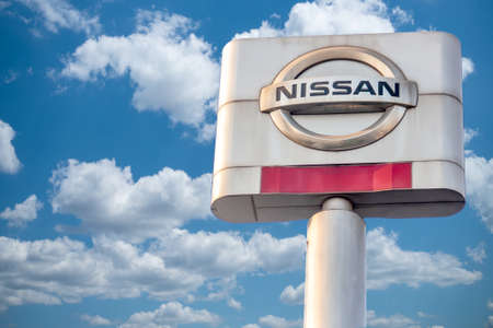 Penticton, British Columbia/Canada - September 1, 2019: close-up of Nissan logo on sign outside car dealership with sky in background