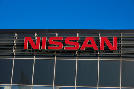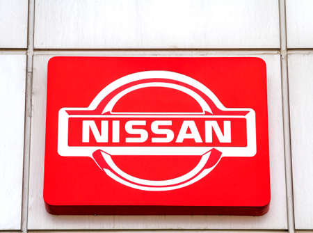 GERMANY, MOENCHENGLADBACH -APRIL 16, 2017: Logotype of Nissan corporation. Nissan company logo on dealership building