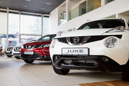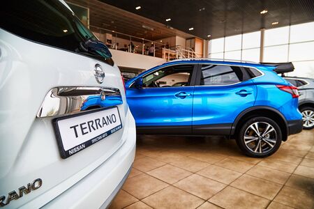 Nizhny Novgorod, Russia - March 14, 2018: Cars in showroom of dealership Nissan in Nizhny Novgorod city in 2018