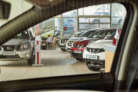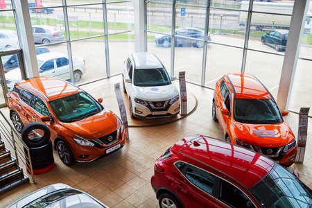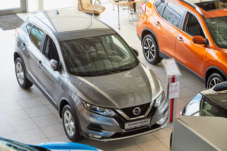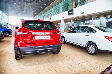 Petrozavodsk, Russia - June 19, 2019: Cars in showroom of dealership Nissan in Petrozavodsk city in Russia