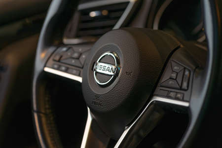 Istanbul, Turkiye - September 2020:View of Nissan Logo on Car Steering Wheel