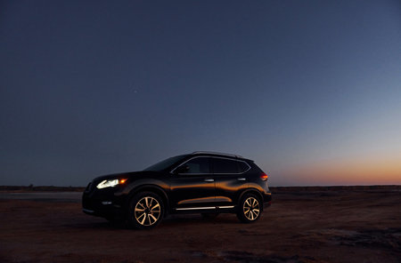 ABU DHABI, UAE - NOV 26, 2016: Nissan company logo on a car illuminated at night