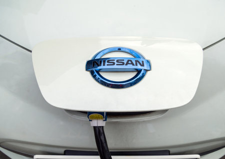 Sochi, Russia - February 2023, 23: Nissan Leaf open charging hatch with cable connected