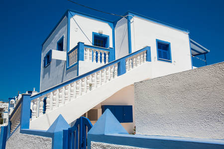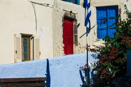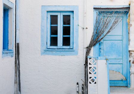 Entrance of a typical greek house with blue widow and door in Santorini island Greece.