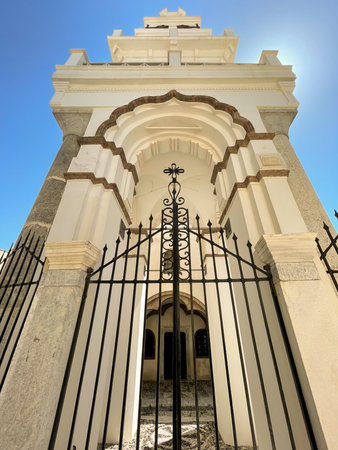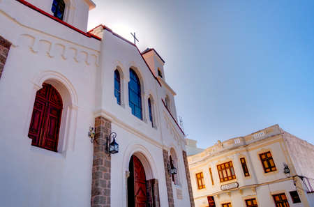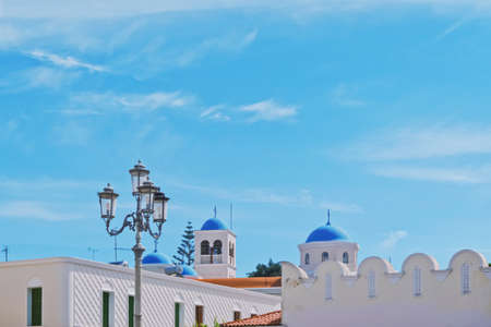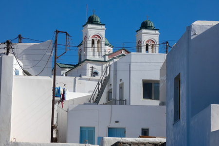 Ana Mera, Greece - September 24, 2019: Low angle view of bell towers on Panagia Tourliani Monastery, a whitewashed church and monastery on Mykonos dating from the 16th century.