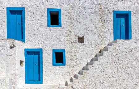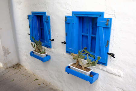 Blue wooden windows with blue wooden shutters on white wall. Bodrum, Turkey.