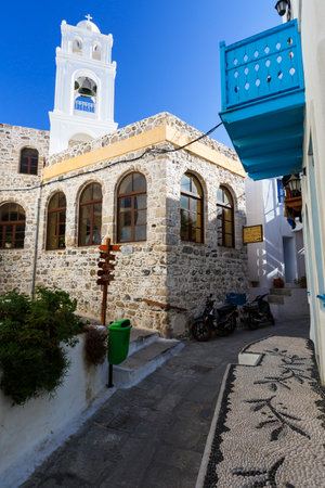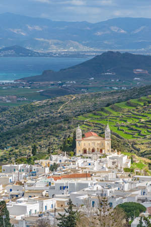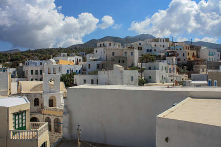 Lefkes, Paros Island, Greece - 27 September 2020: View of the Saint Ioannis Kleidonias in the center of Lefkes. High building against the backdrop of the mountains.