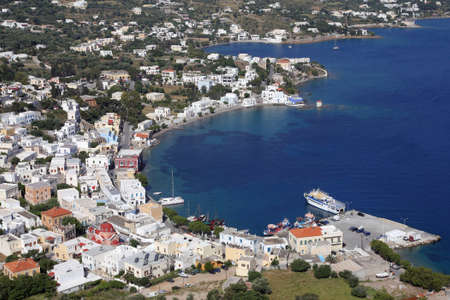 Yacht leaving Mandraki villlage, Capital of Nisyros volcanic island, Dodecanese, Greece.