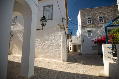 Narrow streets of Neorio town in Poros island, Greece; Old white houses with flowers