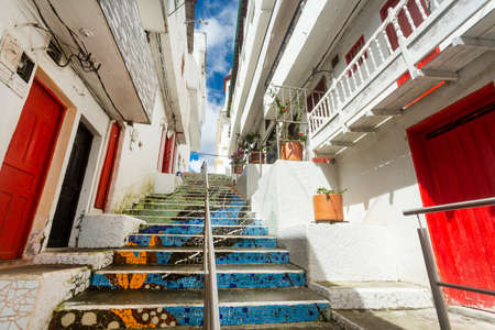 Greece, Kea island. Capital city of Ioulis narrow street with stairs whitewashed and traditional buildings stone facade