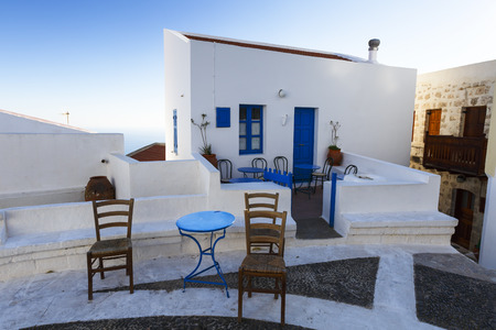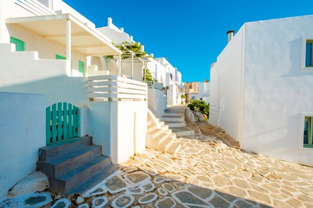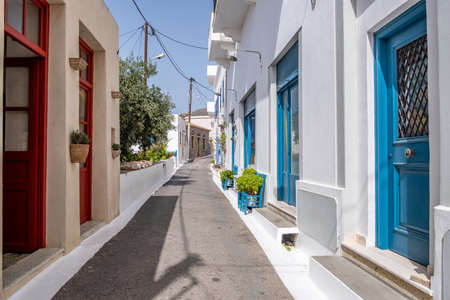 Greece, Kythira island. Empty narrow street at Chora town. Traditional houses and stores white color walls, blue sky background.