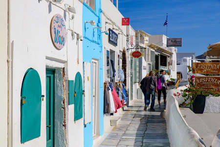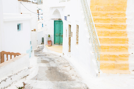 Beautiful Lefkes traditional greek village in Paros island. Charming coffe bars and taverns in colorful narrow streets. Cyclades , Greece