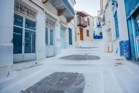 Narrow street in Neorio town on Poros island, Greece. Old white house with blue door and flowers