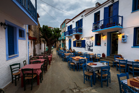 Restaurants in the main street of Chora of Alonissos island, Greece.