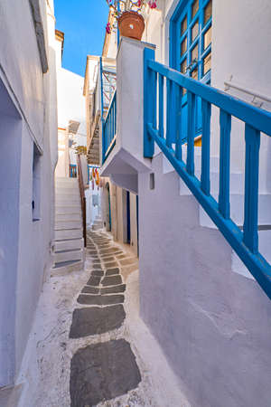 Traditional narrow cobbled streets, beautiful alleyways of Greek island towns. White houses, flower pots, balconies, stairs and doors. Mykonos, Greece