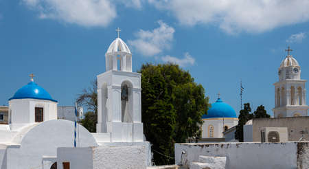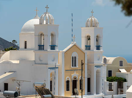 Orthodox Church with its multitiered bell tower facade in Emporio, Santorini, Greece.
