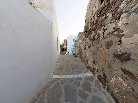 Pano Koufonisi island, Greece. Old and new traditional stonewall building, in white and blue color Cyclades architecture. Empty cobblestone street, blue sky background.