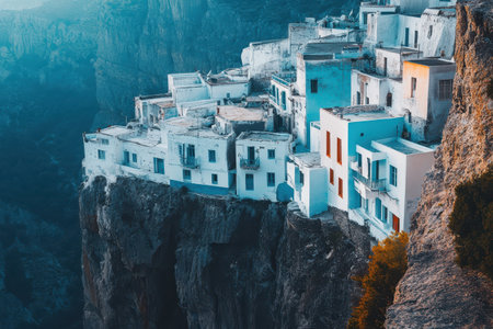 A picturesque village clings to the edge of a cliff, showcasing whitewashed buildings contrasting with the rugged terrain. The soft light of sunset enhances the breathtaking landscape.
