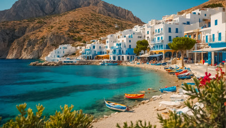Milos island, Klima fishing village, Cyclades Greece. Colorful doors and windows, white waterfront traditional fishermen houses, view from the sea. Boats moored at rippled sea