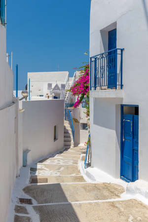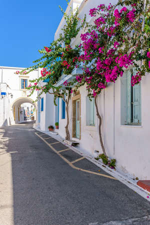 Traditional cycladitic alley with a narrow street, whitewashed houses and a blooming bougainvillea in Lagada, Amorgos Greece