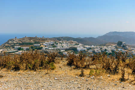 Panorama view of chora Amorgoswith the traditional wind mills , in Amorgos island Greece