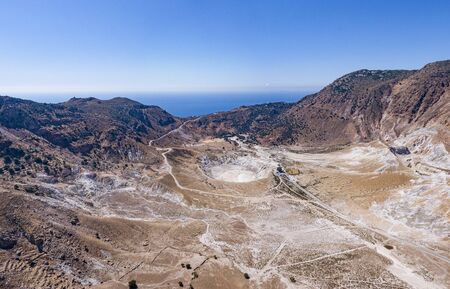 Nisyros island Stefanos volcano crater, Greece, Dodecanese. Aerial drone photo. Giant crater between mountains with aegean sea in front.