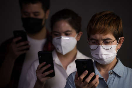 People wearing surgical masks and using their phones looking worried and concerned about the pandemic outbreak and news from social media