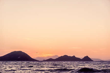 Nature, twilight and vintage beach holiday concept - Summer sunset at the Mediterranean sea coast, seascape and mountain view