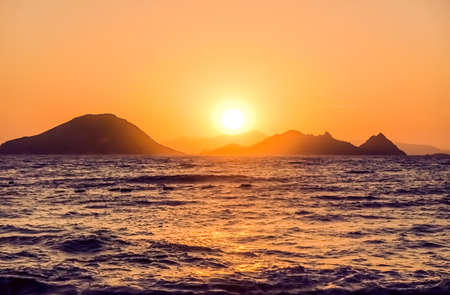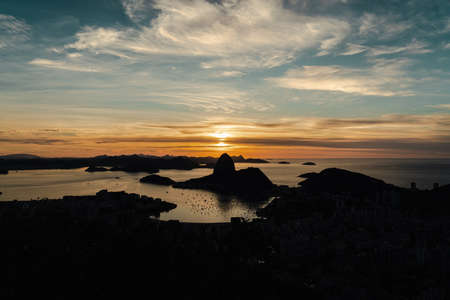 Orange sunset view from the mountains of the City Park in Niteroi, overlooking the dramatic peaks of Rio de Janeiro, Brazil, such as Sugarloaf and the Two Brothers.