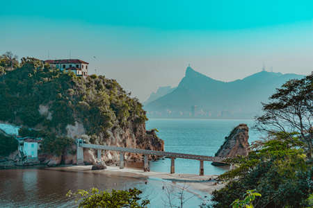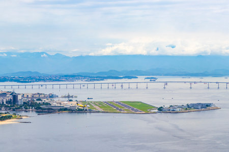 Aerial view of Rio de Janeiro with long bridge. Brazil. Latin America. The best travel destination.